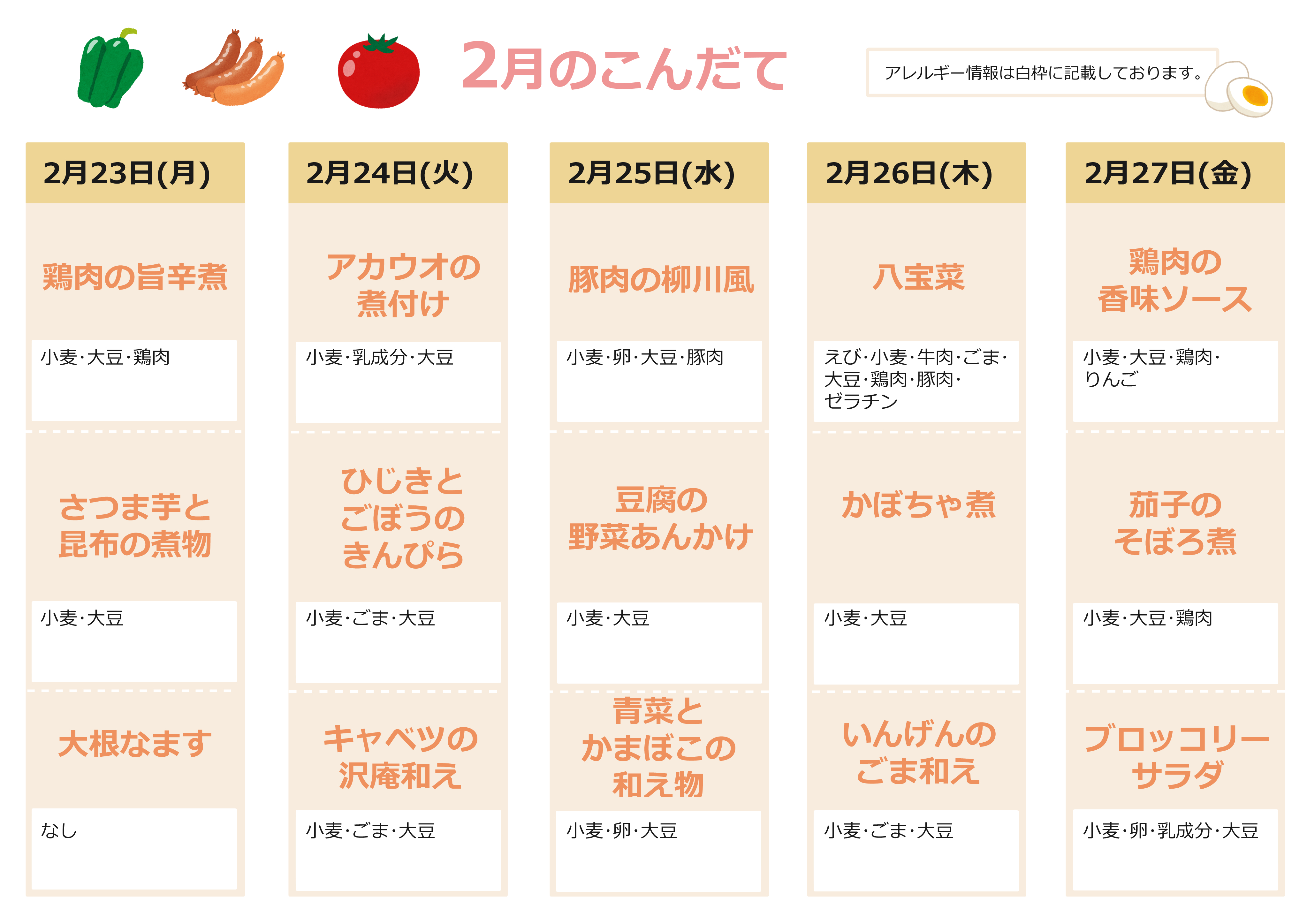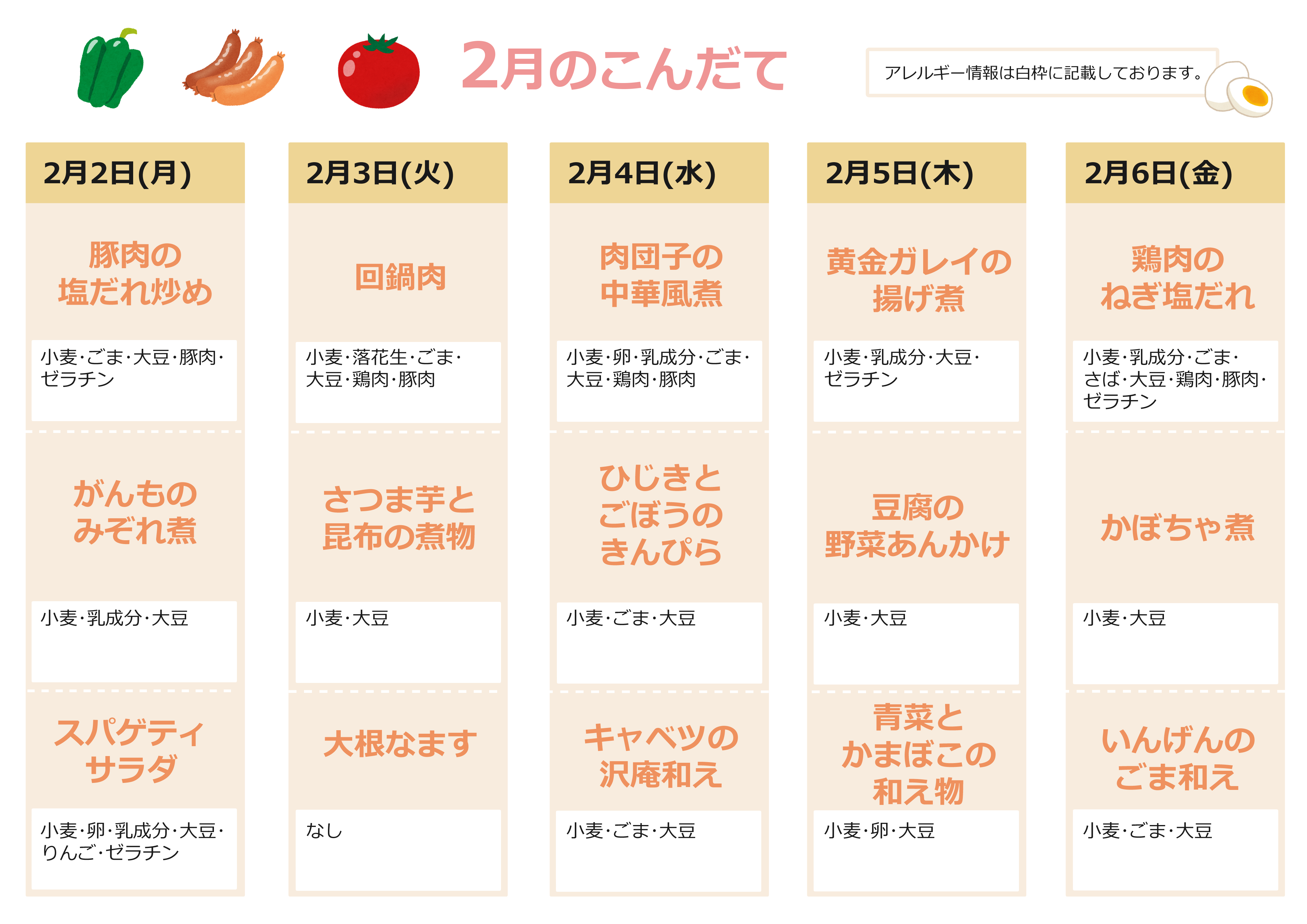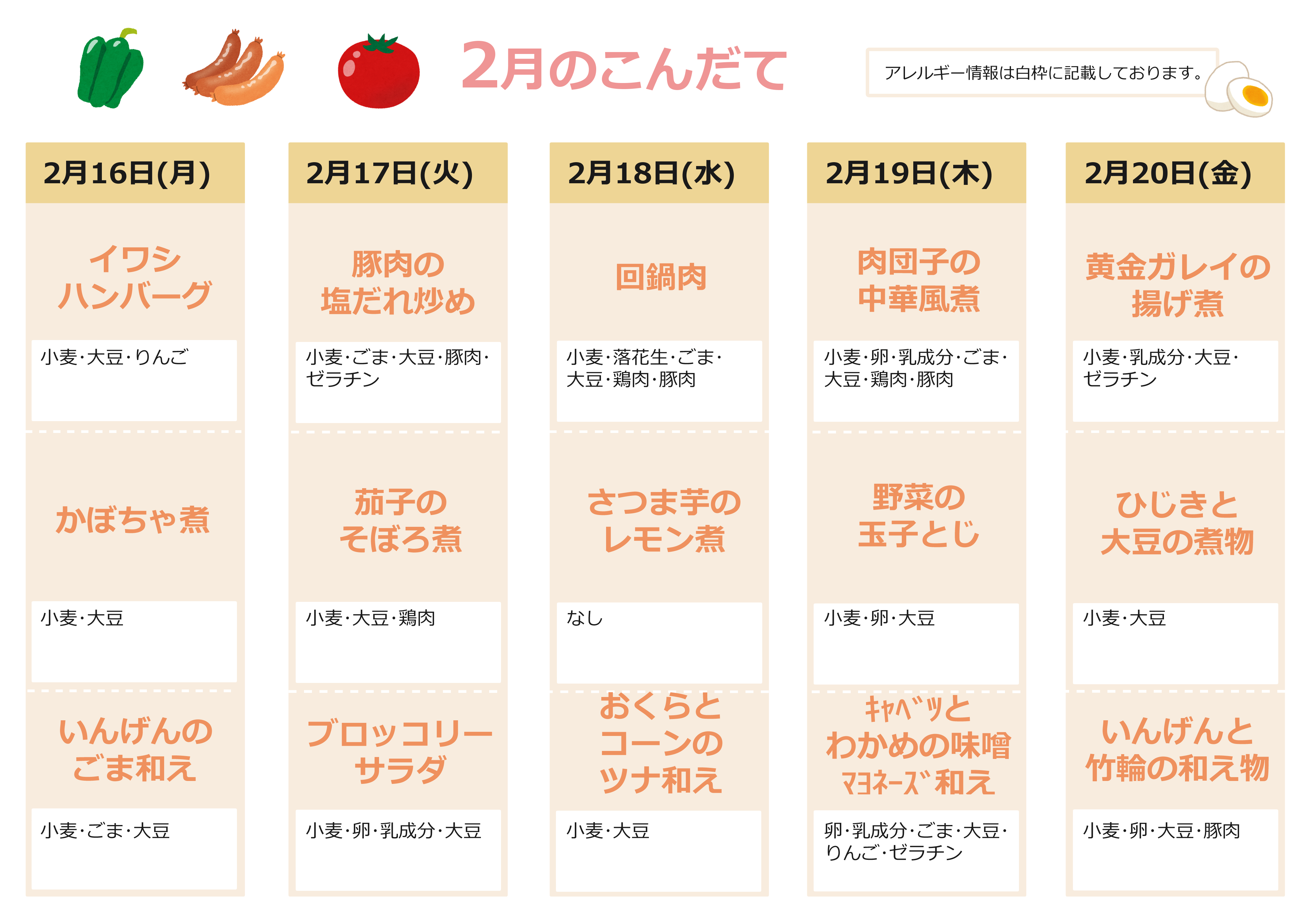 2月の昼食メニューをお知らせします。暦の上では春になりますが、まだまだ寒さが続きそうですね…🍃☃