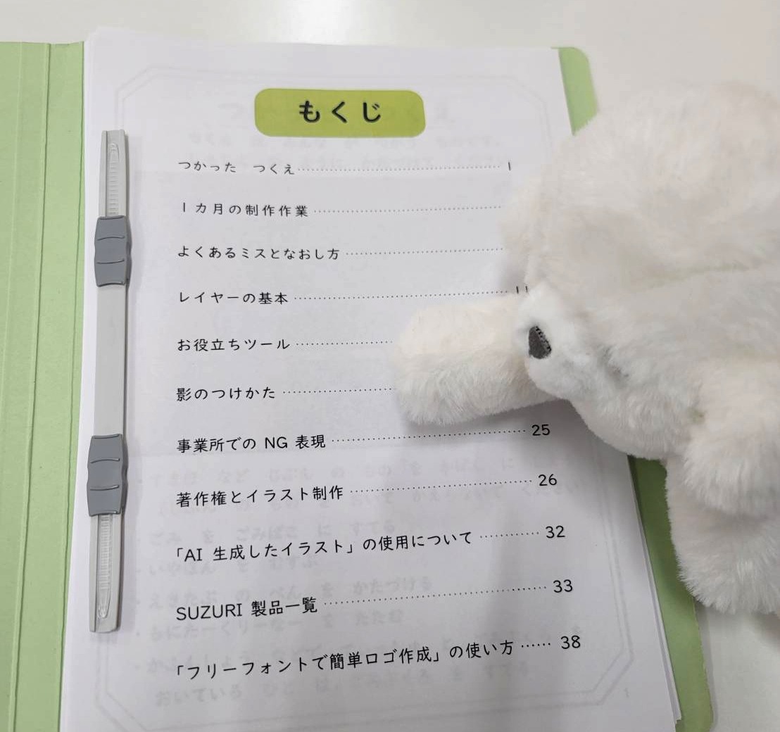 こんにちは! みなさまの作業のサポートアイテムとして、 事業所の作業机に「おやくだちファイル」を 設置いたしました! 以前から置いてあったファイルを、 より一層使いやすく、 みなさんの力になるように スタッフみんなで作りましたので、 ぜひともご活用くださいませ~!